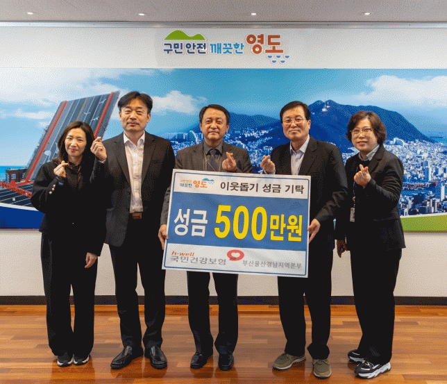 [NWS¹æ¼Û=Çѽ¸ñ ±âÀÚ]±¹¹Î°Ç°­º¸Çè°ø´Ü ºÎ»ê¿ï»ê°æ³²Áö¿ªº»ºÎ´Â Áö³­ 4¿ù 7ÀÏ ¿µµµ±¸¸¦ ¹æ¹®ÇÏ¿© °íµ¶»ç ¿¹¹æ»ç¾÷ Áö¿øÀ» À§ÇÑ ÀÌ¿ôµ½±â ¼º±Ý 500¸¸¿øÀ» ±âŹÇß´Ù. ¿µµµ±¸ °íµ¶»ç ¿¹¹æ »ç¾÷ÀÎ ¡®¿ìÀ¯ Çϳª °ü½É´õÇϱâ, ¶È! ¶È! ¿ìÀ¯ ¿Ô¡¦