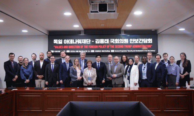 [NWS¹æ¼Û=Çѽ¸ñ ±âÀÚ] ±è¿ëÅ ±¹È¸ÀÇ¿ø(±¹¹ÎÀÇÈû)Àº 4¿ù 8ÀÏ ±¹È¸ÀÇ¿øÈ¸°ü Á¦8°£´ãȸ½Ç¿¡¼­, µ¶ÀÏ Äܶóµå ¾Æµ¥³ª¿öÀç´ÜÀÌ ÃÊûÀ¸·Î ¹æÇÑÇÑ ¡®21¼¼±â ¾Èº¸¿Í ¹ßÀü ¿¬±¸(Security and Development in the 21st Century)¡¯ »çÀý´Ü°ú ÇÔ²² ¡®¡¦