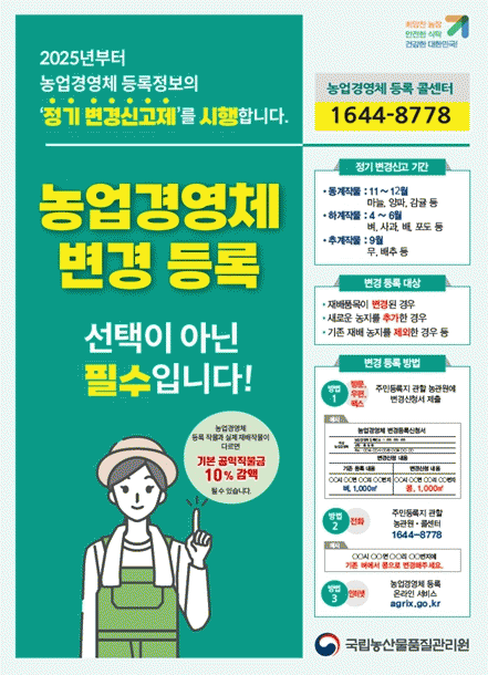 [»çȸ] ±¹¸³³ó»ê¹°Ç°Áú°ü¸®¿ø Àü³²Áö¿ø °î¼º¡¤±¸·Ê»ç¹«¼Ò ³ó¾÷°æ¿µÃ¼, µî·ÏÁ¤º¸ º¯°æµÇ¸é ¡°²À¡± º¯°æ ½Å°íÇϼ¼¿ä! |2025. 04.09