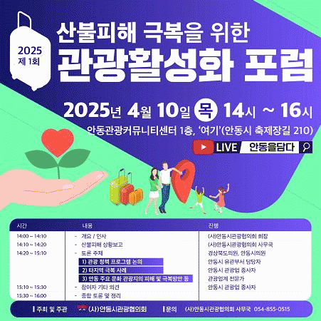 [NWS¹æ¼Û=Çѽ¸ñ ±âÀÚ](»ç)¾Èµ¿½Ã°ü±¤ÇùÀÇȸ´Â 4¿ù 10ÀÏ ¿ÀÈÄ 2½Ã, ¾Èµ¿°ü±¤Ä¿¹Â´ÏƼ¼¾ÅÍ 1Ãþ ¡®¿©±â(¾Èµ¿½Ã ÃàÁ¦À屿 210)¡¯¿¡¼­ ¡®2025 Á¦1ȸ »êºÒÇÇÇØ ±Øº¹À» À§ÇÑ °ü±¤ Ȱ¼ºÈ­ Æ÷·³¡¯À» °³ÃÖÇÑ´Ù°í ¹àÇû´Ù. À̹ø Æ÷·³Àº Áö¿ª ³» °ü±¤¡¦