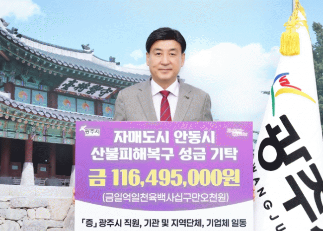 [NWS¹æ¼Û=Çѽ¸ñ ±âÀÚ]±¤Áֽô ÀڸŰῬµµ½ÃÀÎ °æºÏ ¾Èµ¿½ÃÀÇ ´ë±Ô¸ð »êºÒ ÇÇÇØ º¹±¸¸¦ Áö¿øÇϱâ À§ÇØ Àü °øÁ÷ÀÚ, À¯°ü´Üü, Áö¿ª ±â¾÷ µî°ú ÇÔ²² ÃÑ 1¾ï 1õ649¸¸ 5õ ¿øÀÇ ¼º±ÝÀ» ¸ð¾Æ ±âŹÇß´Ù°í 9ÀÏ ¹àÇû´Ù. À̹ø ¼º±ÝÀº Áö³­ 3¿ù¡¦