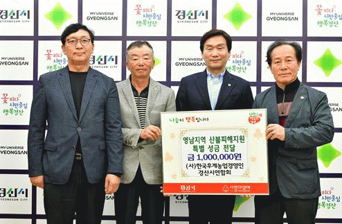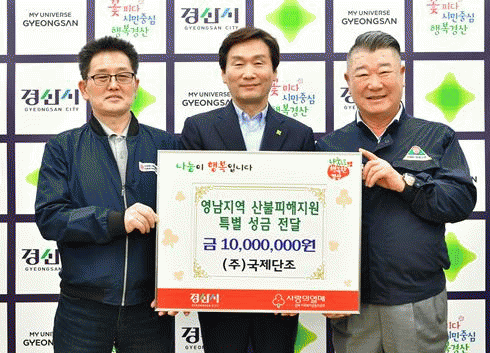 [NWS¹æ¼Û=Çѽ¸ñ ±âÀÚ]±¹Á¦´ÜÁ¶(ÁÖ)´Â 8ÀÏ °æ»ê½ÃûÀ» ¹æ¹®ÇÏ¿© ¿µ³²Áö¿ª »êºÒ·Î ¾î·Á¿òÀ» °Þ°í ÀÖ´Â ÁֹεéÀ» µ½±â À§ÇØ ¼º±Ý 1,000¸¸¿øÀ» ±âŹ Çß´Ù. ±è¿ë¿ì ȸÀåÀº ¡°ÇÇÇØ ÁֹεéÀÌ ´Ù½Ã ÀϾ ¼ö ÀÖµµ·Ï Á¶±ÝÀ̳ª¸¶ ÈûÀ» º¸Å°íÀÚ ¡¦