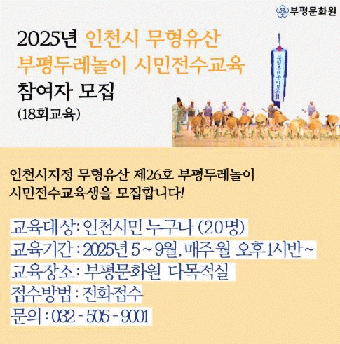 [NWS¹æ¼Û=Çѽ¸ñ ±âÀÚ]ºÎÆò±¸ ºÎÆò¹®È­¿øÀÌ ºÎÆòµÎ·¹³îÀÌÀÇ Àü½ÂÀ» À§ÇØ ¡®2025³â ºÎÆòµÎ·¹³îÀÌ ½Ã¹ÎÀü¼ö±³À°¡¯ Âü¿©ÀÚ¸¦ ¸ðÁýÇÑ´Ù. À̹ø ±³À°Àº ÀÎõ½Ã ¹«Çü¹®È­À¯»êÀÎ ºÎÆòµÎ·¹³îÀÌÀÇ Á¤Ã¼¼º°ú °¡Ä¡¸¦ ½Ã¹Î°ú ÇÔ²² °øÀ¯Çϰí, À̸¦ ÅëÇØ¡¦