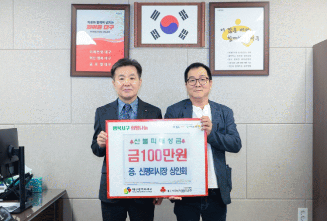 [NWS¹æ¼Û=Çѽ¸ñ ±âÀÚ]´ë±¸ ¼­±¸Ã»Àº ¼­±¸ ÀüÅë½ÃÀåÀΡ®½ÅÆò¸®½ÃÀ塯(»óÀÎȸÀå ¼­Çö±³)°ú¡®¼­ºÎ½ÃÀ塯(»óÀÎȸÀå ±èÁø±â)ÀÌ ÃÖ±Ù ¹ß»ýÇÑ ´ëÇü »êºÒ·Î ¾î·Á¿òÀ» °Þ°í ÀÖ´Â »êºÒ ÇÇÇØÁö¿ªÀ» À§ÇØ °¢ 100¸¸¿øÀÇ ¼º±ÝÀ» ±âŹÇß´Ù°í ¹àÇû´Ù. ¡¦