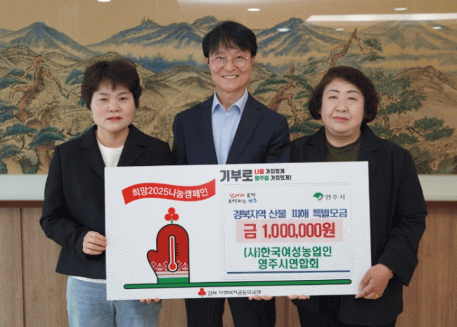 [NWS¹æ¼Û=Çѽ¸ñ ±âÀÚ]¿µÁֽô Áö³­ 9ÀÏ Çѱ¹¿©¼º³ó¾÷ÀÎ ¿µÁֽÿ¬ÇÕȸ°¡ °æºÏÁö¿ª »êºÒ ÇÇÇØ º¹±¸¸¦ À§ÇØ ¼º±Ý 100¸¸ ¿øÀ» ±âŹÇß´Ù°í ¹àÇû´Ù. À̹ø ¼º±ÝÀº ȸ¿øµéÀÌ ÀÚ¹ßÀûÀ¸·Î Âü¿©ÇÑ Æ¯º°¸ð±ÝÀ» ÅëÇØ ¸¶·ÃµÈ °ÍÀ¸·Î, ÃÖ±Ù °æºÏÁö¿ª¿¡¡¦