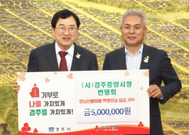 [NWS¹æ¼Û=Çѽ¸ñ ±âÀÚ]°æÁֽà Áß¾Ó½ÃÀå »óÀÎȸ´Â ÃÖ±Ù ¿µ³²Áö¿ª¿¡¼­ ¹ß»ýÇÑ ´ë±Ô¸ð »êºÒ·Î ÇÇÇØ¸¦ ÀÔÀº ÀÌÀç¹ÎµéÀ» µ½±â À§ÇØ ¼º±Ý 500¸¸¿øÀ» ±âŹÇß´Ù. °æÁֽà Áß¾Ó½ÃÀåÀº 1900³â´ë ÃʺÎÅÍ ¿î¿µµÇ´ø ÀϹݽÃÀåÀ¸·Î, 1983³â Çö´ëÈ­°¡ ¿Ï·á¡¦