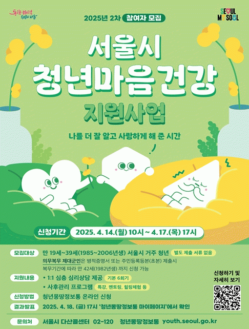 [°Ç°­] ¼­¿ï½Ã, ¸¶À½ÀÇ ±æÀâÀÌ¿¡¼­ ÀλýÀÇ ±æÀâÀ̷Ρ¦Ã»³â ¸¶À½°Ç°­ Áö¿ø 2Â÷ ¸ðÁý |2025. 04.09