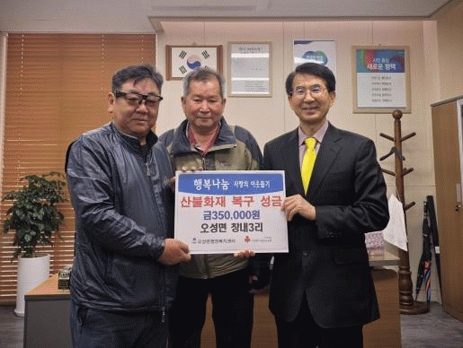 [NWS¹æ¼Û=Çѽ¸ñ ±âÀÚ]ÆòÅýà ¿À¼º¸é â³»3¸® ¸¶À»È¸¿¡¼­ Áö³­ 8ÀÏ ÃÖ±Ù »êºÒ·Î ÇÇÇØ°¡ ÀÖ´Â ÀÌ¿ôµéÀ» µ½±â À§ÇØ ¼º±Ý 35¸¸ ¿øÀ» ¿À¼º¸é ÇàÁ¤º¹Áö¼¾ÅÍ¿¡ Àü´ÞÇß´Ù. â³»3¸® ³ëÀÎȸÀåÀº ¡°¿¹±âÄ¡ ¸øÇÑ »êºÒ·Î »îÀÇ ÅÍÀüÀ» ÀÒÀº Áֹε鿡°Ô¡¦