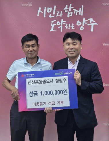 [NWS¹æ¼Û=Çѽ¸ñ ±âÀÚ]¾çÁֽà ³²¸é ½Å»êÈï³ó Á¾¹¦»ç°¡ Áö³­ 17ÀÏ ³²¸é ÇàÁ¤º¹Áö¼¾Å͸¦ ¹æ¹®ÇØ ÀÌ¿ôµ½±â ¼º±Ý 100¸¸¿øÀ» Àü´ÞÇß´Ù. ½Å»êÈï³ó Á¾¹¦»ç´Â ¸Å³â Ãß¼®¸¶´Ù ¼Ò¿ÜµÈ ÀÌ¿ôÀ» À§ÇÑ ³ª´® Ȱµ¿À» À̾î¿À°í ÀÖÀ¸¸ç, ¿ÃÇØµµ º¯ÇÔ¾øÀÌ ¡¦
