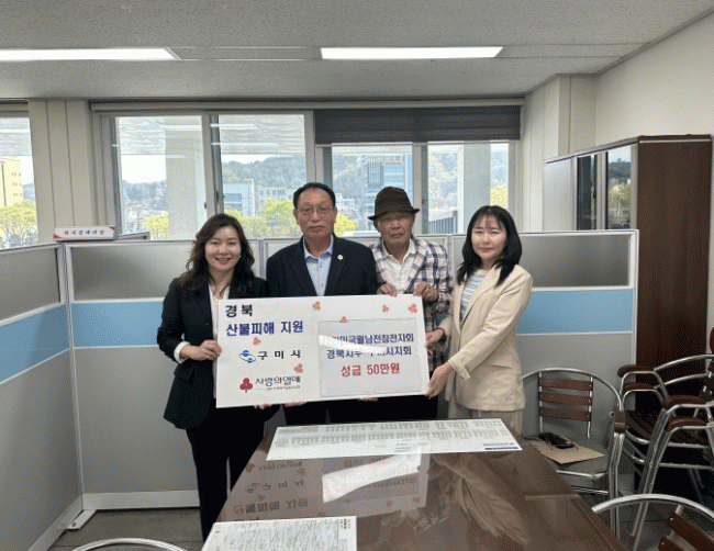 [NWS¹æ¼Û=Çѽ¸ñ ±âÀÚ]¿ù³²ÀüÂüÀüÀÚȸ ±¸¹Ì½ÃÁöȸ°¡ Áö³­ 8ÀÏ °æºÏÁö¿ª »êºÒ ÇÇÇØ º¹±¸¸¦ À§ÇØ ¼º±Ý 50¸¸ ¿øÀ» »çȸº¹Áö°øµ¿¸ð±Ýȸ¿¡ ±âŹÇß´Ù. À̹ø ¼º±ÝÀº »êºÒ·Î »îÀÇ ÅÍÀüÀ» ÀÒÀº µµ¹ÎµéÀ» µ½±â À§ÇØ È¸¿øµéÀÌ ÇѸ¶À½À¸·Î ¸ð±ÝÇÑ °Í¡¦