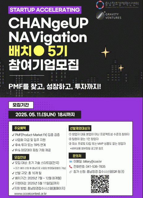 [NWS¹æ¼Û=Çѽ¸ñ ±âÀÚ] Ãæ³²Ã¢Á¶°æÁ¦Çõ½Å¼¾ÅÍ¿¡¼­ ¿À´Â 5¿ù 11ÀÏ ¿ÀÈÄ 6½Ã±îÁö ¿ì¼öÇÑ ±â¼ú ½ºÅ¸Æ®¾÷ÀÇ ¼ºÀå À§ÇÑ 2025 CHANGeUP NAVIgation ¹èÄ¡(Batch) 5±â ÇÁ·Î±×·¥ Âü°¡±â¾÷À» ¸ðÁýÇÑ´Ù°í ¹àÇû´Ù. À̹ø ¹èÄ¡ ÇÁ·Î±×·¥ÀÇ ÇÙ½É ¸ñÇ¥´Â¡¦