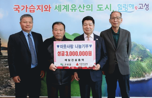 [NWS¹æ¼Û=Çѽ¸ñ ±âÀÚ]¸ÅÀϰǼ³¿ë¿ªÀº 4¿ù 8ÀÏ °í¼º±ºÃ»À» ¹æ¹®ÇÏ¿© ¾î·Á¿î ÀÌ¿ôÀ» À§ÇØ ¼º±Ý 300¸¸ ¿øÀ» Àü´ÞÇß´Ù. ¸ÅÀϰǼ³¿ë¿ªÀº ÁöºØ°³·®, ÁÖÅà ½ÅÃࡤº¸¼ö, Á¶°æ, Åä¸ñ µî °Ç¼³¾÷°ú Á÷¾÷¼Ò°³¾÷À» Çϰí ÀÖ´Â ¾÷ü·Î, Áö¿ª »çȸ¿¡ ´ë¡¦