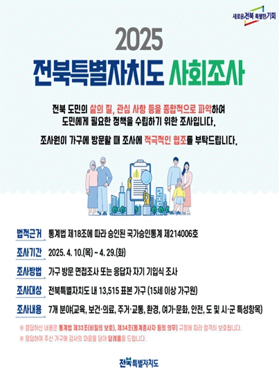 [NWS¹æ¼Û=Çѽ¸ñ ±âÀÚ]ÀüºÏƯº°ÀÚÄ¡µµ´Â µµ¹Î »îÀÇ Áú Çâ»ó°ú Á¤Ã¥ ¼³°è¸¦ À§ÇÑ µ¥ÀÌÅÍ È®º¸¸¦ ¸ñÀûÀ¸·Î, 4¿ù 10ÀϺÎÅÍ 29ÀϱîÁö 14°³ ½Ã±º°ú ÇÔ²² ¡®2025 ÀüºÏƯº°ÀÚÄ¡µµ »çȸÁ¶»ç¡¯¸¦ ÀÏÁ¦È÷ ½Ç½ÃÇÑ´Ù. ÀÌ Á¶»ç´Â 2007³âºÎÅÍ ¸Å³â ÃßÁø¡¦