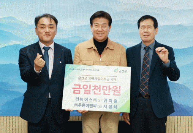 [NWS¹æ¼Û=Çѽ¸ñ ±âÀÚ]¸®´º¾î½º¢ß ±ÇÁöÈÆ ´ëÇ¥¿Í ¢ßµÎÇöÀÌ¿£¾¾ ¼­Á¤½Ä ´ëÇ¥´Â Áö³­ 8ÀÏ ±Ý»ê±º ¹ßÀüÀ» À§ÇÑ °íÇâ»ç¶û±âºÎ±Ý 1000¸¸ ¿øÀ» ÄèôÇß´Ù. µÎ ¾÷ü´Â °ø°øÇϼö ¹× Æó¼ö 󸮽ü³À» ¿î¿µÇϴ ȯ°æÀü¹® ±â¾÷À¸·Î ±Ý»ê±º °ø°øÇϼöó¡¦