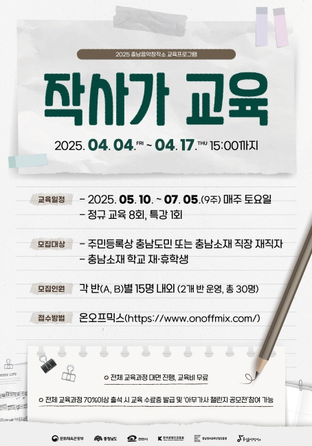 [NWS¹æ¼Û=Çѽ¸ñ ±âÀÚ]Ãæ³²Á¤º¸¹®È­»ê¾÷ÁøÈï¿øÀº Áö¿ª ´ëÁßÀ½¾Ç»ê¾÷ Ȱ¼ºÈ­¸¦ ¸ñÀûÀ¸·Î ¡®2025³âµµ Àۻ簡 ±³À° ÇÁ·Î±×·¥¡¯ÀÇ ±³À°»ýÀ» ¿À´Â 4¿ù 7ÀϺÎÅÍ ¸ðÁýÇÑ´Ù°í ¹àÇû´Ù. ÀÌ ÇÁ·Î±×·¥Àº âÀÛ ÄÜÅÙÃ÷ Á¦ÀÛ, ÀÎÀç ¾ç¼º ¹× Áö¿ª ¹ÂÁö¼Ç¡¦