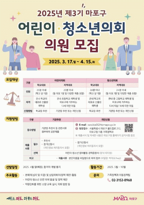 [NWS¹æ¼Û=Çѽ¸ñ ±âÀÚ]¸¶Æ÷±¸´Â ¡®Á¦3±â ¸¶Æ÷±¸ ¾î¸°ÀÌ¡¤Ã»¼Ò³âÀÇȸ¡¯¿¡¼­ Ȱµ¿ÇÒ ¾î¸°ÀÌ¡¤Ã»¼Ò³â ÀÇ¿øÀ» 4¿ù 15ÀϱîÁö ¸ðÁýÇÑ´Ù. ¸ðÁý ´ë»óÀº ¸¶Æ÷±¸¿¡ °ÅÁÖÇÏ´Â 18¼¼ ¹Ì¸¸ ¶Ç´Â Áö¿ª ³» ÃÊ¡¤Áß¡¤°íµîÇб³¿¡ ÀçÇÐ ÁßÀÎ ¾î¸°ÀÌ¿Í Ã»¼Ò³â¡¦