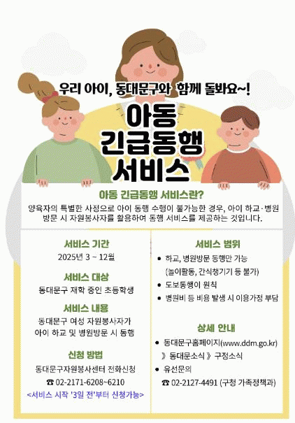 [NWS¹æ¼Û=Çѽ¸ñ ±âÀÚ]¼­¿ï µ¿´ë¹®±¸°¡ ¾Æµ¿ ¾çÀ° °¡Á¤ÀÇ ºÎ´ãÀ» ´ú±â À§ÇØ ¿ÃÇØµµ ¡®¾Æµ¿±ä±Þµ¿Ç༭ºñ½º¡¯¸¦ ¿î¿µÇÑ´Ù. ÀÌ ¼­ºñ½º´Â º¸È£ÀÚ°¡ °©ÀÛ½º·¯¿î »çÁ¤À¸·Î ÀÚ³àÀÇ Çϱ³³ª º´¿ø ¹æ¹® µî¿¡ ÇÔ²²ÇÒ ¼ö ¾øÀ» ¶§, ÀÚ¿øºÀ»çÀÚ°¡ ¾ÆÀÌ¡¦