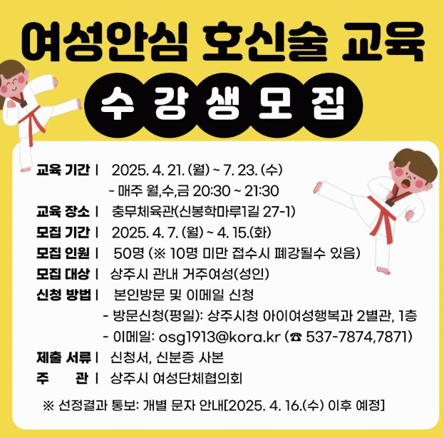 [NWS¹æ¼Û=Çѽ¸ñ ±âÀÚ]»óÁֽà ¿©¼º´ÜüÇùÀÇȸ¿¡¼­´Â °ü³» °ÅÁÖ ¿©¼º(¼ºÀÎ)À» ´ë»óÀ¸·Î 2025³â ¿©¼º¾È½É È£½Å¼ú ±³À°À» ¿î¿µÇÑ´Ù. ¸ðÁýÀοøÀº 50¸íÀ̸ç, ¸ðÁý ±â°£Àº 4¿ù 7ÀϺÎÅÍ 4¿ù 15ÀϱîÁöÀÌ´Ù. À̹ø ±³À°Àº 4¿ù 21ÀϺÎÅÍ 7¿ù 23Àϱ