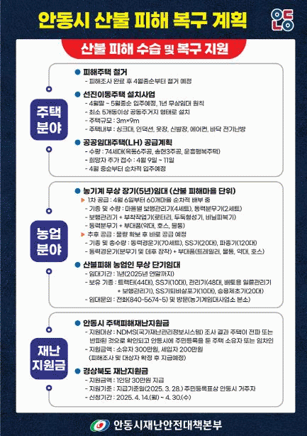 [NWS¹æ¼Û=Çѽ¸ñ ±âÀÚ]¾Èµ¿½Ã´Â ÃÖ±Ù ¹ß»ýÇÑ ´ëÇü»êºÒ·Î ÇÇÇØ¸¦ ÀÔÀº ÁֹεéÀ» À§ÇØ ÁÖÅú¹±¸, ³ó¾÷ Áö¿ø, Àç³­Áö¿ø±Ý Áö±Þ µî ´Ù°¢ÀûÀÎ Áö¿øÃ¥À» º»°ÝÀûÀ¸·Î ½ÃÇàÇϰí ÀÖ´Ù. ¸ÕÀú, ÁÖÅà ºÐ¾ß¿¡¼­´Â ÇÇÇØÁ¶»ç°¡ ¿Ï·áµÈ ÁÖÅÃÀ» ´ë»óÀ¸·Î ¡¦