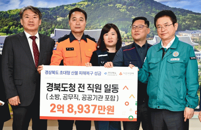 [NWS¹æ¼Û=Çѽ¸ñ ±âÀÚ]°æºÏµµ´Â 3¿ù¿¡ ¹ß»ýÇÑ ÃÊ´ëÇü »êºÒ·Î Å« ÇÇÇØ¸¦ ÀÔÀº 5°³ ½Ã±ºÀÇ ÇÇÇØº¹±¸¸¦ À§ÇØ µµÃ» Àü Á÷¿øÀÌ ¸ðÀº ¼º±Ý 2¾ï 8,937¸¸¿øÀ» 8ÀÏ °æºÏ»çȸº¹Áö°øµ¿¸ð±Ýȸ¿¡ Àü´ÞÇß´Ù. À̹ø ¼º±ÝÀº µµÃ» °ø¹«¿ø, °ø¹«Á÷, ¼Ò¹æº»ºÎ¡¦