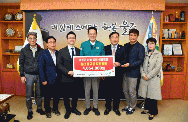 [NWS¹æ¼Û=Çѽ¸ñ ±âÀÚ]¿ï»ê µ¿±¸Ã»ÀÌ 8ÀÏ ¿ïÁÖ±º »êºÒ·Î ÇÇÇØ Áö¿ª ÁÖ¹ÎÀ» µ½±â À§ÇØ Á÷¿øµéÀÌ ÀÚ¹ßÀûÀ¸·Î ¸ðÀº ¼º±Ý 405¸¸4õ¿øÀ» Àü´ÞÇß´Ù. ¿ïÁÖ±ºÀº À̳¯ ±ºÃ» ¼ÒȸÀǽǿ¡¼­ À̼ø°É ±º¼ö, ±èÁ¾ÈÆ ¿ï»ê µ¿±¸Ã»Àå µî °ü°èÀÚµéÀÌ Âü¼®ÇÑ¡¦