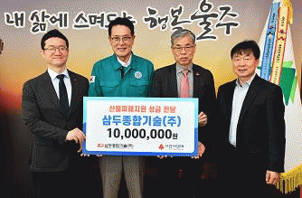 [NWS¹æ¼Û=Çѽ¸ñ ±âÀÚ]»ïµÎÁ¾ÇÕ±â¼ú(ÁÖ) ÃÖ¿µ¼ö ´ëÇ¥°¡ 8ÀÏ ¿ïÁÖ±º »êºÒ·Î ÇÇÇØ Áö¿ª ÁÖ¹ÎÀ» µ½±â À§ÇØ ¼º±Ý 1õ¸¸¿øÀ» Àü´ÞÇß´Ù. ¿ïÁÖ±ºÀº À̳¯ ±ºÃ» ¼ÒȸÀǽǿ¡¼­ À̼ø°É ±º¼ö, »ïµÎÁ¾ÇÕ±â¼ú(ÁÖ) ÃÖ¿µ¼ö ´ëÇ¥ µîÀÌ Âü¼®ÇÑ °¡¿îµ¥ ¼º±Ý¡¦