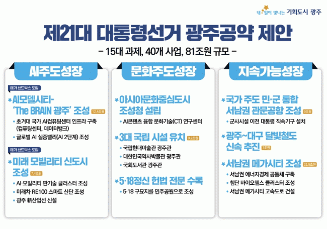 [NWS¹æ¼Û=Çѽ¸ñ ±âÀÚ]±¤ÁÖ±¤¿ª½Ã°¡ Á¦21´ë ´ëÅë·É¼±°Å ±¤ÁÖÁö¿ª °ø¾àÀ¸·Î AI(ÀΰøÁö´É) ¸ðµ¨½ÃƼ-´õ ºê·¹ÀÎ ±¤ÁÖ, ¹Ì·¡¸ðºô¸®Æ¼ ½Åµµ½Ã, ºÐ»ê¿¡³ÊÁö Çãºê, ¾Æ½Ã¾Æ¹®È­Á߽ɵµ½Ã 2.0½Ã´ë, ´ëÀÚº¸µµ½Ã ½ÇÇöÀ» À§ÇÑ ±³ÅëÀÎÇÁ¶ó ±¸Ãà µî 15´ë¡¦