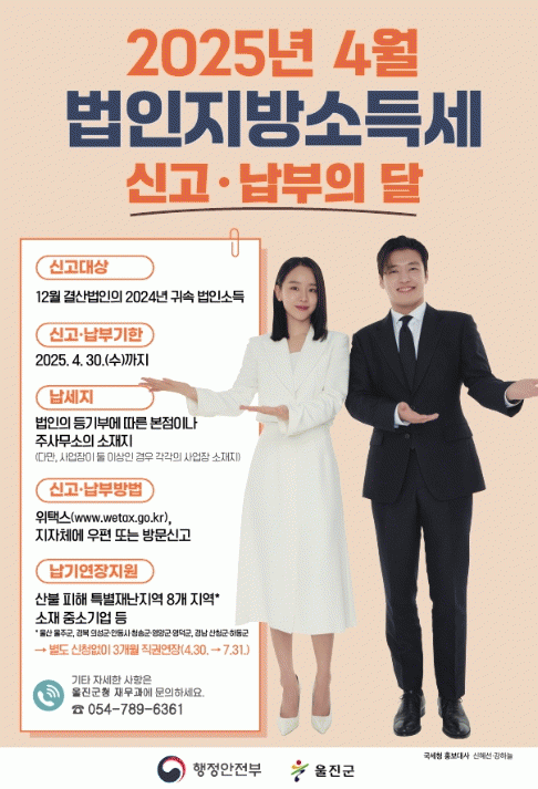 [NWS¹æ¼Û=Çѽ¸ñ ±âÀÚ]¿ïÁø±º(±º¼ö ¼Õº´º¹)Àº ¿À´Â 4¿ù 30ÀϱîÁö ¹ýÀÎÁö¹æ¼Òµæ¼¼ ½Å°í¡¤³³ºÎ±â°£À» ¿î¿µÇÑ´Ù°í ¹àÇû´Ù. ½Å°í´ë»óÀº 2024³â 12¿ù ¸» °á»ê¹ýÀÎÀ¸·Î ¼Òµæ±Ý¾×ÀÌ ¾ø°Å³ª °á¼Õ±ÝÀÌ ÀÖ´Â ¹ýÀÎÀÌ¶óµµ ¹Ýµå½Ã ½Å°íÇØ¾ß ÇÑ´Ù. ¡¦