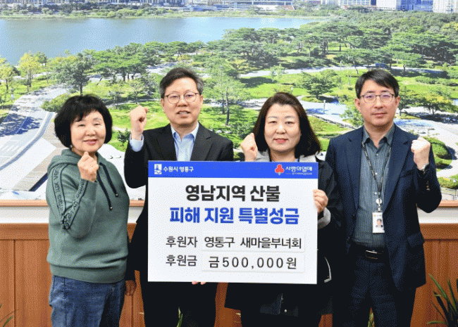 [NWS¹æ¼Û=Çѽ¸ñ ±âÀÚ]¿µÅ뱸 »õ¸¶À»ºÎ³àȸ´Â Áö³­ 8ÀÏ, ÃÖ±Ù ¹ß»ýÇÑ ¿µ³²Áö¿ª ´ë±Ô¸ð »êºÒ·Î ÇÇÇØ¸¦ ÀÔÀº ÀÌÀç¹ÎµéÀ» µ½±â À§ÇØ 50¸¸ ¿øÀÇ ¼º±ÝÀ» Àü´ÞÇß´Ù. À̹ø ¼º±Ý ±âºÎ´Â ÇÇÇØ Áö¿ª ÁֹεéÀÇ ½Å¼ÓÇÑ º¹±¸¿Í »ýȰ ¾ÈÁ¤¿¡ µµ¿òÀÌ µÇ°í¡¦
