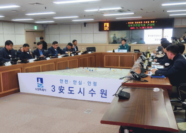 [NWS¹æ¼Û=Çѽ¸ñ ±âÀÚ]¼ö¿ø½Ã°¡ 7ÀÏ ½Ãû Àç³­¾ÈÀü»óȲ½Ç¿¡¼­ ¡®¼ö¿ø½Ã ÁöÇϽü³¹° À¯°ü±â°ü °£´ãȸ¡¯¸¦ ¿­°í, Áö¹ÝħÇÏ »ç°í°¡ ¹ß»ýÇßÀ» ¶§ ¼±Á¦ ´ëÀÀÇÒ ¹æ¾ÈÀ» ³íÀÇÇß´Ù. À̳¯ °£´ãȸ¿¡´Â ±èÇö¼ö ¼ö¿ø½Ã Á¦1ºÎ½ÃÀåÀ» ºñ·ÔÇØ ±¹°¡Ã¶µµ¡¦