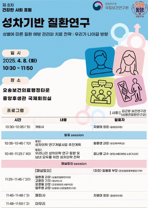 [NWS¹æ¼Û=Çѽ¸ñ ±âÀÚ]Áúº´°ü¸®Ã»Àº 2025³â Á¦1ȸ Áúº´ ¿¹¹æ¡¤°ü¸® ÁÖ°£À» ¸ÂÀÌÇÏ¿© 4¿ù 8ÀÏ ¼ºº°ÀÌ °Ç°­¿¡ ¹ÌÄ¡´Â ¿µÇâÀ» °úÇÐÀûÀ¸·Î ±Ô¸íÇÑ ¡®¼ºÂ÷ ±â¹Ý Áúȯ ¿¬±¸¡¯¸¦ ÁÖÁ¦·Î'Á¦8Â÷ °Ç°­ÇÑ »çȸ Æ÷·³'À» °³ÃÖÇÑ´Ù. '°Ç°­ÇÑ »çȸ Æ÷¡¦