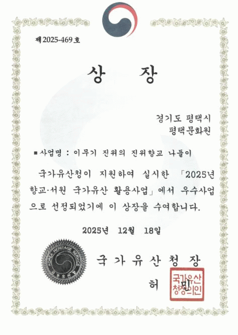 [NWS¹æ¼Û=Çѽ¸ñ ±âÀÚ]ÆòÅù®È­¿øÀº 12¿ù 18ÀÏ ´ëÀü ÀüÅ볪·¡°ü ´Ù¸ñÀû°­´ç¿¡¼­ ¿­¸° ±¹°¡À¯»êû ÁÖÃÖ ¡®2025 ¿ì¸®°íÀå ±¹°¡À¯»ê Ȱ¿ë ¿ì¼ö»ç¾÷ ½Ã»ó½Ä¡¯¿¡¼­ ÆòÅù®È­¿øÀÇ ¡®À̹«±â ÁøÀ§ÀÇ ÁøÀ§Çâ±³ ³ªµéÀÌ¡¯°¡ ¿ì¼ö»ç¾÷(±¹°¡À¯»êûÀå»ó¡¦