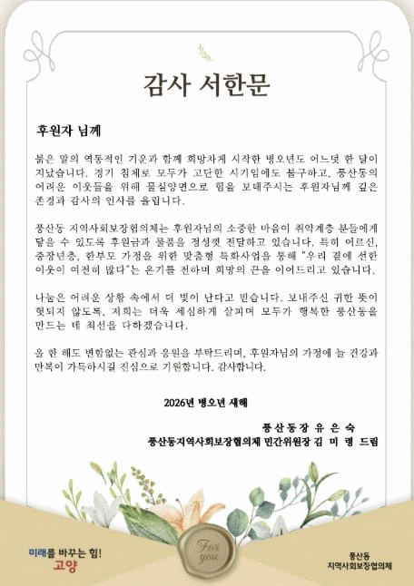 [»çȸ] °í¾ç½Ã dz»êµ¿ Áö¿ª»çȸº¸ÀåÇùÀÇü, ¼³¸íÀý ¸Â¾Æ ÈÄ¿øÀÚ¿¡ °¨»ç ¼­Çѹ® Àü´Þ |2026. 02.04