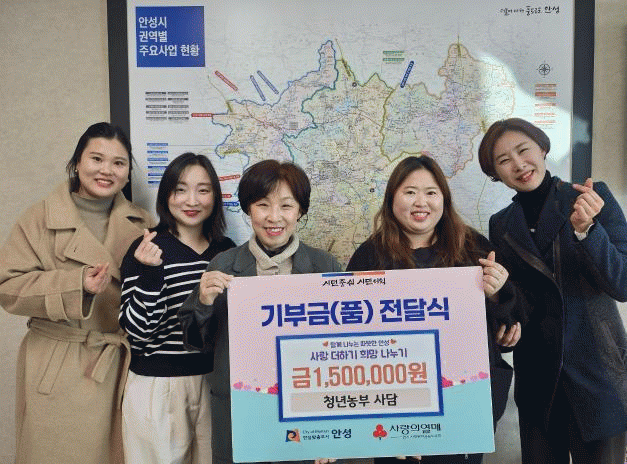 [NWS¹æ¼Û=Çѽ¸ñ ±âÀÚ]û³â³óºÎ »ç´ãÀº 2¿ù 9ÀÏ ¾È¼º½Ã¸¦ ¹æ¹®ÇØ ¼º±Ý 150¸¸ ¿øÀ» ±âŹÇß´Ù°í ¹àÇû´Ù. À̹ø ±âŹÀº û³â³óºÎ »ç´ãÀÌ ¿î¿µÇÑ ¡®»ç´ãÀ塯 ÆÇ¸Å ¼öÀͱÝÀ» ±¸¼º¿øµéÀÌ ÀÚ¹ßÀûÀ¸·Î ¸ð¾Æ ¸¶·ÃÇÑ °ÍÀ¸·Î, ¾È¼º½Ã ÀÚ¸³Áغñû³âÀ»¡¦
