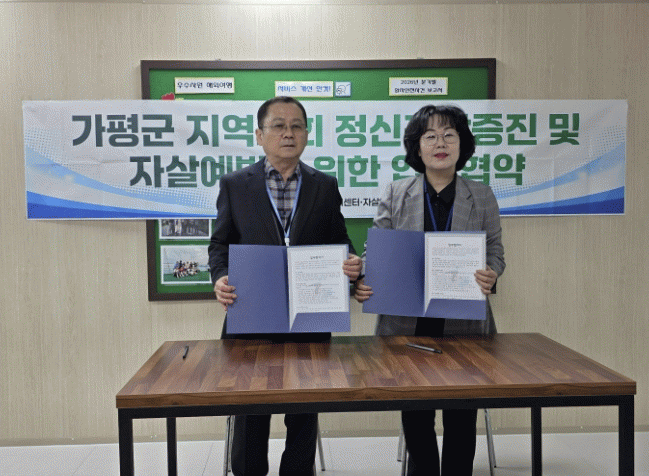 [NWS¹æ¼Û=Çѽ¸ñ ±âÀÚ]°¡Æò±ºÁ¤½Å°Ç°­º¹Áö¼¾ÅÍ¡¤Àڻ쿹¹æ¼¾ÅÍ´Â Áö¿ª»çȸ Á¤½Å°Ç°­ ÁõÁø°ú ÀÚ»ì ¿¹¹æÀ» À§ÇØ Ã»Æò¿ì¸®º´¿ø°ú ¾÷¹«Çù¾à(MOU)À» ü°áÇß´Ù°í 9ÀÏ ¹àÇû´Ù. Áö³­ 7ÀÏ Ã¼°áµÈ À̹ø Çù¾àÀº ÃÖ±Ù Áõ°¡ÇÏ´Â Á¤½Å°Ç°­ ¹®Á¦¿Í ÀÚ»ì À§¡¦