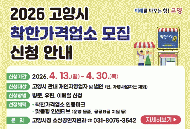 [»çȸ] °í¾ç½Ã, '2026³â ÂøÇѰ¡°Ý¾÷¼Ò' °ø°³ ¸ðÁý |2026. 04.13