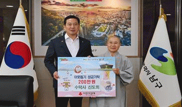 [NWS¹æ¼Û=Çѽ¸ñ ±âÀÚ]¼ö´ö»ç(ÁÖÁö: Á¾Áø½º´Ô) ½ÅµµÈ¸´Â Áö³­ 3ÀÏ, ¼Ò¿ÜµÈ ¾î·Á¿î ÀÌ¿ôÀ» À§ÇØ ¼º±Ý 200¸¸¿øÀ» ´ë±¸ ³²±¸Ã»¿¡ ±âŹÇß´Ù. ¼ö´ö»ç´Â ³²±¸ ¾Õ»ê °í»ê°ñ¿¡ À§Ä¡ÇØ ÀÖ´Â »çÂû·Î, ½ÅµµµéÀÌ Æò¼Ò Á¶±Ý¾¿ ½ÃÁÖ¸¦ ¸ð¾Æ À̹ø ¼º¡¦