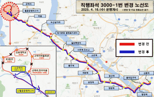 [NWS¹æ¼Û=Çѽ¸ñ ±âÀÚ]±èÆ÷½Ã´Â 4¿ù 16ÀϺÎÅÍ Á÷ÇàÁ¼® 3000-1¹ø ¹ö½º³ë¼±ÀÇ ´ÜÃà(Æ÷³»2¸®~ °í¸·¸® ¹Ì°æÀ¯) ¹× Á¤·ù¼Ò º¯°æ(±ºÇϸ®.Çѿ츶À» ¡æ ±ºÇϸ®)À» ½ÃÇàÇÑ´Ù°í ¹àÇû´Ù. 3000-1¹ø ¹ö½º´Â 1ȸ Æò±Õ ¿îÇà½Ã°£ÀÌ 4½Ã°£ °¡±îÀÌ µÇ°í ¿Õ¡¦