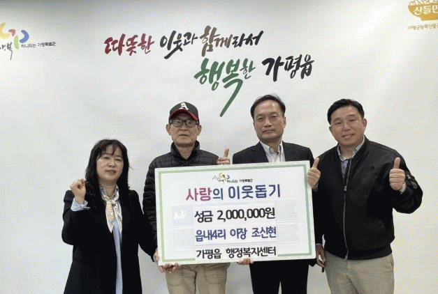 [NWS¹æ¼Û=Çѽ¸ñ ±âÀÚ]°¡Æò±º °¡ÆòÀ¾ À¾³»4¸® Á¶½ÅÇö ÀÌÀåÀÌ 7ÀÏ °¡ÆòÀ¾ ÇàÁ¤º¹Áö¼¾Å͸¦ ã¾Æ ÀÌ¿ôµ½±â ¼º±Ý 200¸¸ ¿øÀ» ±âŹÇß´Ù. À̹ø ¼º±ÝÀº Á¶ ÀÌÀåÀÌ ¸¶À» ÀÌÀåÀ¸·Î Ȱµ¿Çϸç Áö±Þ¹ÞÀº Ȱµ¿º¸»ó±ÝÀ» Áö¿ª»çȸ¿¡ ÀÇ¹Ì ÀÖ°Ô È¯¿øÇÏ°í¡¦