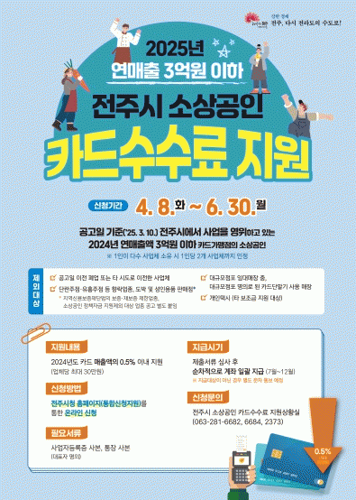 [»çȸ] ÀüÁÖ½Ã, ¼Ò»ó°øÀÎ Ä«µå¼ö¼ö·á Áö¿ø»ç¾÷ Á¢¼ö °³½Ã |2025. 04.08
