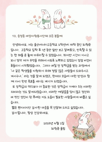 [NWS¹æ¼Û=Çѽ¸ñ ±âÀÚ]¿ï»ê ºÏ±¸ ¼ÛÁ¤µ¿ ¿©¼ºÀÚ¿øºÀ»çȸ´Â Áö³­´Þ ÀåÇбÝÀ» Àü´ÞÇÑ ¿ï»ê¿¡³ÊÁö°íµîÇб³ ÃÖ¿øÁØ ±ºÀ¸·ÎºÎÅÍ °¨»çÆíÁö¸¦ ¹Þ¾Ò´Ù°í 8ÀÏ ¹àÇû´Ù. ÃÖ ±ºÀº ÆíÁö¿¡¼­ "¹«¾ùÀ» À§Çؼ­ ³»°¡ ³ë·ÂÇϰí ÀÖ´ÂÁö ºñÀüÀÌ Èçµé¸®°í ÀÖ¾ú¡¦