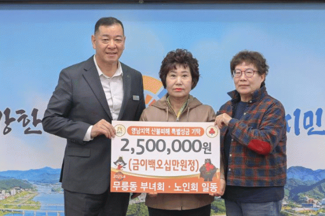 [NWS¹æ¼Û=Çѽ¸ñ ±âÀÚ]°øÁֽô Áö³­ 7ÀÏ ½Ãû ÁýÇö½Ç¿¡¼­ ¹«¸ªµ¿ ºÎ³àȸ¿Í ³ëÀÎȸ·ÎºÎÅÍ ¿µ³² Áö¿ª »êºÒ ÇÇÇØ º¹±¸¸¦ À§ÇÑ ¼º±Ý 250¸¸¿øÀ» Àü´Þ¹Þ¾Ò´Ù°í ¹àÇû´Ù. À̹ø ¼º±ÝÀº ¹«¸ªµ¿ ºÎ³àȸ¿øµéÀÌ °©ÀÛ½º·¯¿î »êºÒ Àç³­¿¡ °íÅë¹Þ´Â ÀÌ¡¦