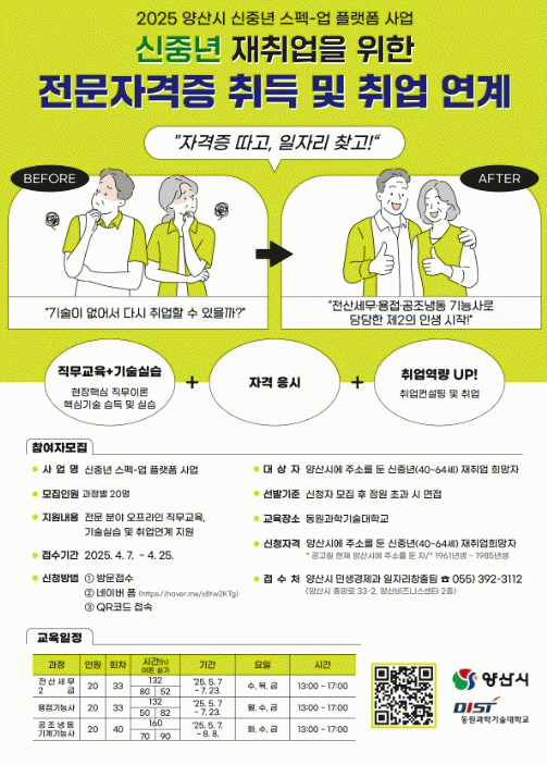 [NWS¹æ¼Û=Çѽ¸ñ ±âÀÚ]¾ç»ê½Ã´Â ½ÅÁß³â(40~64¼¼) °èÃþÀÇ ÀçÃë¾÷À» Áö¿øÇϱâ À§ÇØ ¡®½ÅÁ߳⠽ºÆå-¾÷ Ç÷§Æû »ç¾÷¡¯À» ÃßÁøÇϰí, Àü¹®ÀÚ°ÝÁõ Ãëµæ ¹× Ãë¾÷ ¿¬°è °úÁ¤À» ¿î¿µÇÑ´Ù. ÀÌ¿¡ µû¶ó 4¿ù 7ÀϺÎÅÍ 4¿ù 25ÀϱîÁö ±³À°»ýÀ» ¸ðÁýÇϸç,¡¦