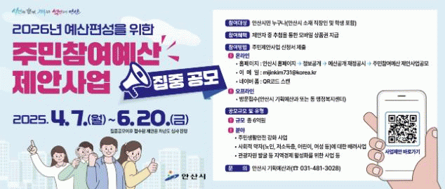 [NWS¹æ¼Û=Çѽ¸ñ ±âÀÚ]¾È»ê½Ã´Â ¿À´Â 6¿ù 20ÀϱîÁö 2026³â ¿¹»ê¿¡ ¹Ý¿µµÉ ÁÖ¹ÎÂü¿©¿¹»ê Á¦¾È »ç¾÷ ÁýÁß °ø¸ð¿¡ ³ª¼±´Ù°í 7ÀÏ ¹àÇû´Ù. 2012³âºÎÅÍ ½ÃÀÛµÈ ÁÖ¹ÎÂü¿©¿¹»êÀº ¿¹»ê ¿î¿ë¿¡ ÁÖ¹ÎÀÇ ¸ñ¼Ò¸®¸¦ Á÷Á¢ ¹Ý¿µÇÒ ¼ö ÀÖ´Â Á¦µµ·Î, ÇàÁ¤°ú¡¦
