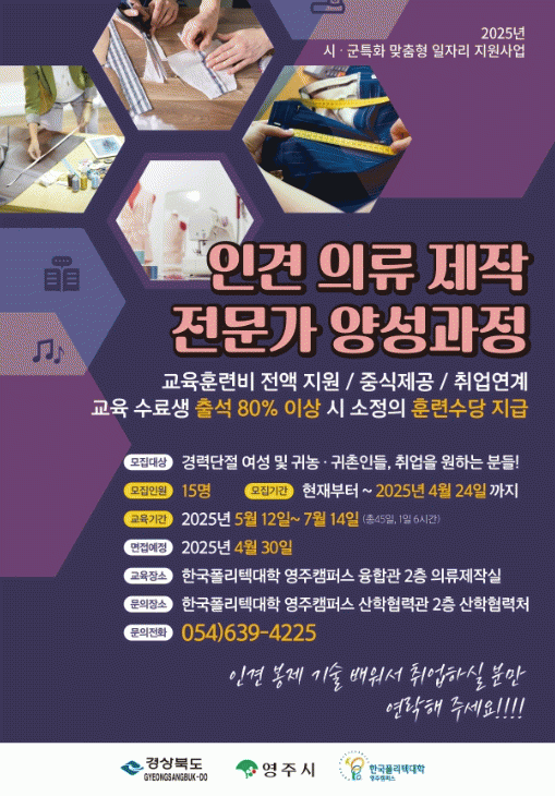 [NWS¹æ¼Û=Çѽ¸ñ ±âÀÚ]¿µÁֽô ¡®À롧 ÀÇ·ù Á¦ÀÛ Àü¹®°¡ ¾ç¼º °úÁ¤¡¯ ±³À° Âü¿©ÀÚ¸¦ ¿À´Â 24ÀϱîÁö ¸ðÁýÇÑ´Ù°í ¹àÇû´Ù. À̹ø ±³À°Àº ¿µÁÖ½Ã¿Í Çѱ¹Æú¸®ÅØ¥µ´ëÇÐ »êÇÐÇù·Â´Ü ¿µÁÖÁö¼Ò°¡ ÄÁ¼Ò½Ã¾öÀ» ±¸¼ºÇØ, °æ»óºÏµµ ¡®½Ã±º Ưȭ ¸ÂÃãÇü¡¦
