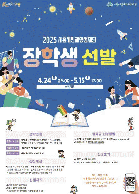 [NWS¹æ¼Û=Çѽ¸ñ ±âÀÚ](Àç)½ÃÈï½ÃÀÎÀç¾ç¼ºÀç´ÜÀº ¹Ì·¡¸¦ ¼±µµÇÒ À¯´ÉÇÑ ÀÎÀ縦 ¹ß±¼¤ý¾ç¼ºÇϱâ À§ÇÑ ¡®2025³âµµ ÀåÇлý ¼±¹ß ¹× Áö¿ø°èȹ¡¯À» ¹ßÇ¥Çß´Ù. °èȹ¿¡ µû¸£¸é, ½ÃÈï½ÃÀÎÀç¾ç¼ºÀç´ÜÀº °ü³» 1³â ÀÌ»ó °ÅÁÖÇÏ´Â ½Ã¹ÎÀ» ´ë»óÀ¸·Î 1¡¦