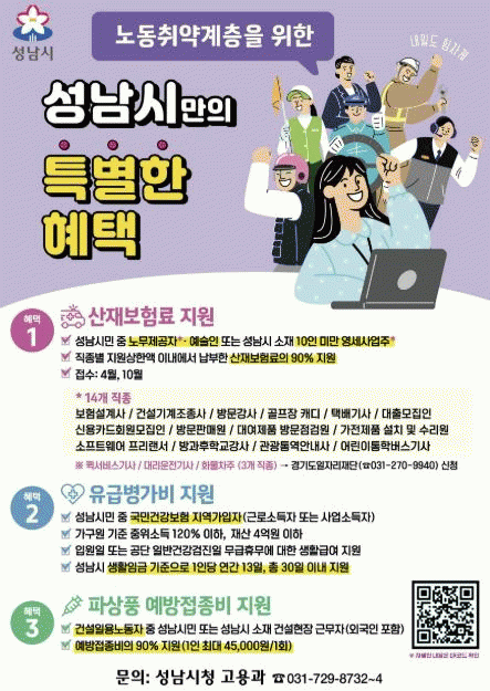 [NWS¹æ¼Û=Çѽ¸ñ ±âÀÚ]¼º³²½Ã´Â ³ë¹«Á¦°øÀÚ¿Í ¿¹¼úÀÎ µî »çȸ¾ÈÀü¸ÁÀÇ »ç°¢Áö´ë¿¡ ³õÀÎ ³ëµ¿Ãë¾à°èÃþÀ» ´ë»óÀ¸·Î »êÀ纸Çè·á¸¦ Áö¿øÇÑ´Ù. Áö¿ø ´ë»óÀº ¼º³²½Ã¿¡ Áֹεî·ÏÀÌ µÇ¾î ÀÖ´Â ³ë¹«Á¦°øÀÚ(14°³ Á÷Á¾)¿Í ¿¹¼úÀÎ, ±×¸®°í À̵é°ú Àü¡¦