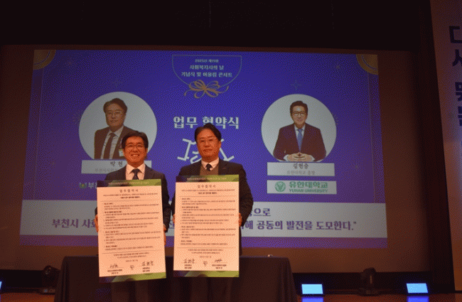 [NWS¹æ¼Û=Çѽ¸ñ ±âÀÚ]À¯ÇÑ´ëÇб³´Â Áö³­ 4¿ù 3ÀÏ ºÎõ½Ãû ¾î¿ï¸¶´ç¿¡¼­ ¿­¸° ¡®Á¦19ȸ »çȸº¹Áö»çÀÇ ³¯¡¯ ±â³ä½Ä¿¡¼­ ºÎõ½Ã»çȸº¹Áö»çÇùȸ(ȸÀå ¹ÚÇö)¿Í »çȸº¹Áö Àü¹®Àη ¾ç¼º°ú ±³À°Áö¿ø °­È­¸¦ À§ÇÑ ¾÷¹«Çù¾àÀ» ü°áÇß´Ù°í ¹àÇû´Ù¡¦