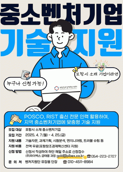 [NWS¹æ¼Û=Çѽ¸ñ ±âÀÚ]Æ÷Ç׽ð¡ 2025 Áß¼Òº¥Ã³±â¾÷ ±â¼úÁö¿ø»ç¾÷¿¡ Âü¿©ÇÒ ±â¾÷À» Æ÷Ç×âÁ¶°æÁ¦Çõ½Å¼¾ÅÍ¿¡¼­ ¿À´Â 25ÀϱîÁö ¸ðÁýÇÑ´Ù°í ¹àÇû´Ù. ÀÌ »ç¾÷Àº ±â¼úÀû ÇѰè·Î ¾î·Á¿òÀ» °Þ°í ÀÖ´Â Áö¿ª ±â¾÷À» ´ë»óÀ¸·Î Àü¹®ÀûÀÎ ±â¼ú ÄÁ¼³ÆÃ¡¦