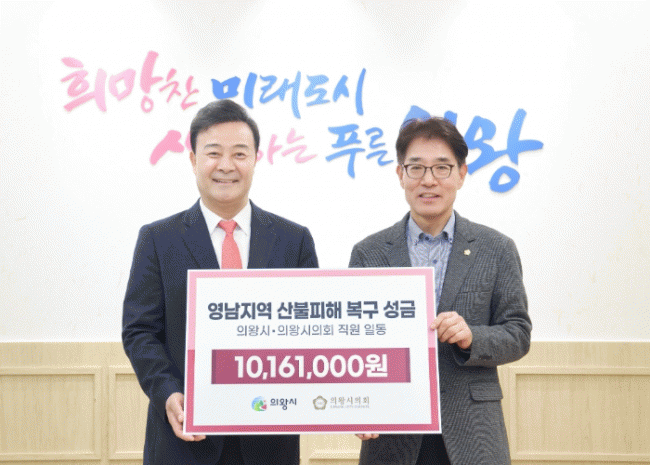[NWS¹æ¼Û=Çѽ¸ñ ±âÀÚ]¿µ³²Áö¿ª »êºÒÇÇÇØ º¹±¸¿Í ÀÌÀç¹Î Áö¿øÀ» À§ÇÑ ±¸È£¼º±Ý ¸ð±Ý¿¡ ÀÇ¿Õ½Ã¿Í ÀǿսÃÀÇȸ°¡ Àû±Ø µ¿ÂüÇß´Ù. ÀÇ¿Õ½Ã¿Í ÀǿսÃÀÇȸ °øÁ÷ÀÚµéÀº 7ÀÏ Àü´Þ½ÄÀ» °®°í »êºÒÇÇÇØ º¹±¸ Áö¿ø ¼º±ÝÀ¸·Î 1,016¸¸ 1,000¿øÀ» ±âŹÇß¡¦